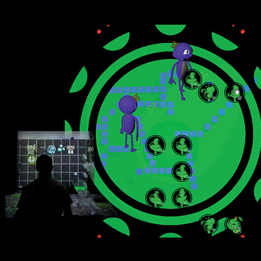 During the period of the installation the space evolves, changes and mutates in response to player interaction and autonomous evolution. Each time the work was installed a persistent simulation was established that allowed the work to evolve over days or weeks at a time. An online representation of this world simulation was uploaded at the end of each day that tracked the shifts and changes in population and movement between the six basic elements of the world.